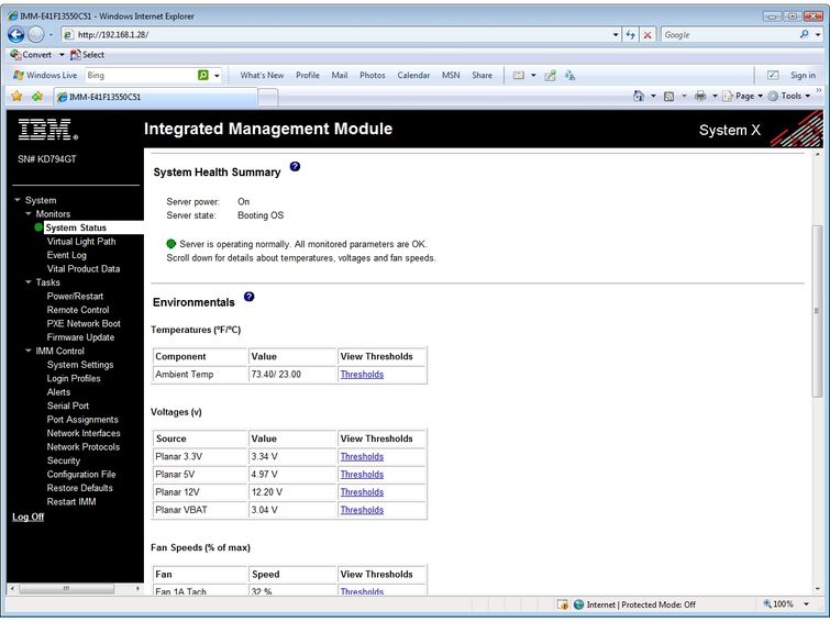 Đối với việc quản lý từ xa IMM của IBM (tích hợp quản lý module) thông qua các cổng mạng chuyên dụng và giao diện web để theo dõi thành phần quan trọng, kiểm soát Power và cập nhật phần mềm.Điều này cho biết thêm chức năng bổ sung cho các giao diện hệ thống giám sát trực tiếp nơi bạn có thể tính toán việc tiêu hao năng lượng , đồ thị xem nhiệt độ máy chủ tiêu thụ điện năng cộng với hệ thống và công suất điện . Đối với quản lý mạng nói chung, hệ thống giám sát trực tiếp này có thể chạy những dò tìm tất cả các thiết bị SNMP, tuân thủ quy tắc và triển khai các phụ kiện cho các hệ thống của IBM và không phải của IBM.